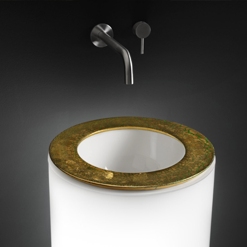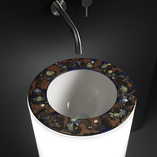 The perfect basin prepared for both freestanding and wall installation. A useful objects that is also a work of art: the hand-worked worktop has a particular intensity, roughness and marbling, evoking the great artists of the twentieth century, The Artwork 1960 round basin becomes as prestigious witness of Italian craftsmanship and a declaration of uncompromising originality.