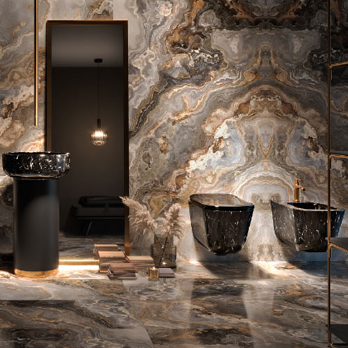 Available in 5 different colour variations. Each bathroom installation acquires a unique character thanks the the mix of ceramics and precious stones that enhance its surface.