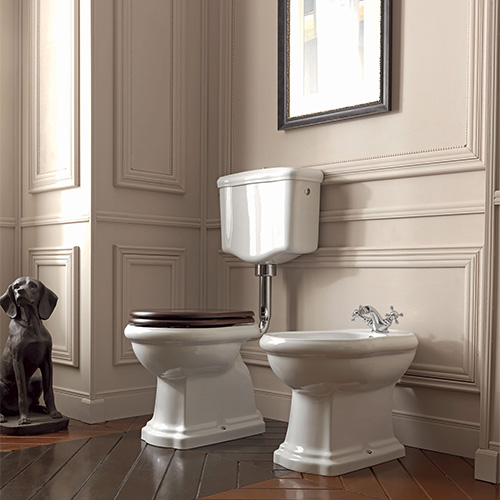 The retro low level cistern is available in white, gloss black, matt black, matt hazel and matt green with a chrome, gold or bronze finish.