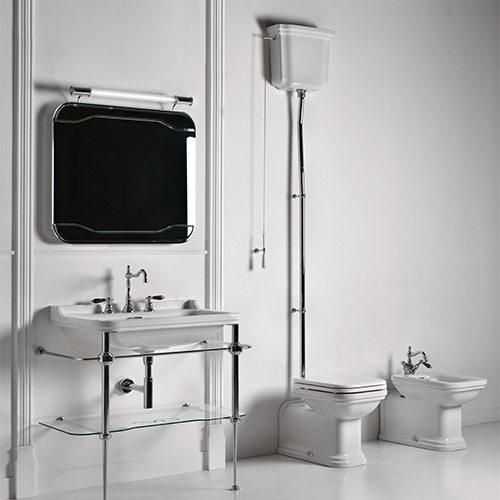 Combine the Waldorf high level cistern with the Waldorf Prolungato back to wall toilet pan (4116), cistern fittings with pull and chain (7545) and high level flush pipe (7573). All sold separately.