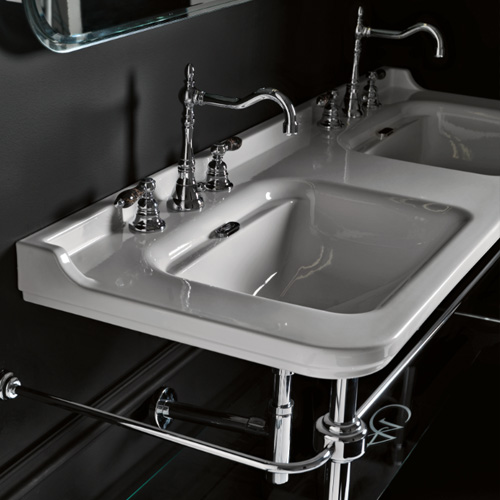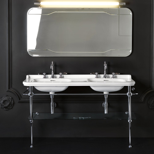 The Waldorf metal washstand for the Waldorf double basin (4143) can be used for personal care but also for storing different kinds of items, thanks to the useful glass shelf in the lower part of the vanity unit.
